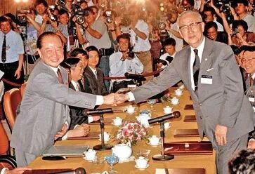 ▎1993年4月27日,时任海峡两岸关系协会会长汪道涵、海峡交流基金会董事长辜振甫举行“汪辜会谈”首次会议。图源:共产党员网